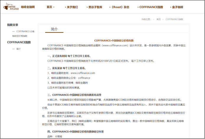 COFFINANCE·中国咖啡豆价格指数由饮品界(www.coffinance.com)设计并开发,是一款参照国内外各因素,反映中国云南咖啡豆价格的指数。