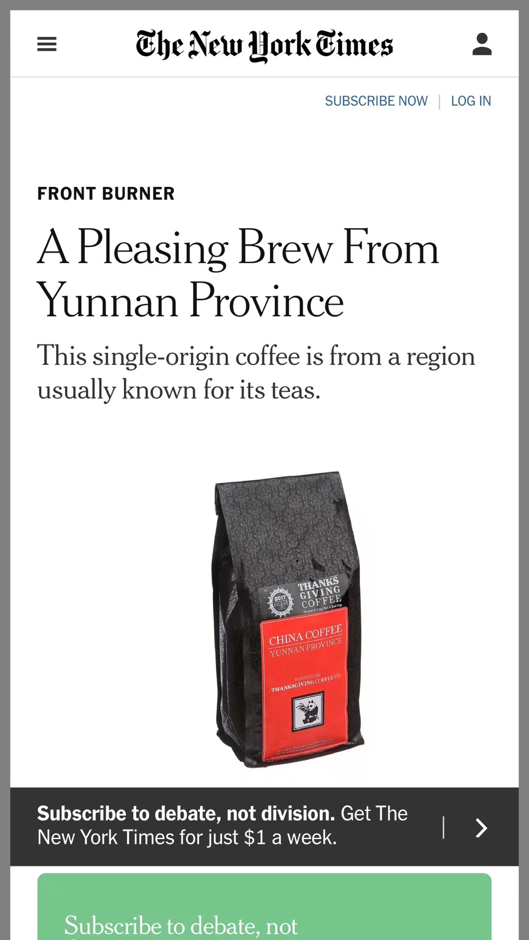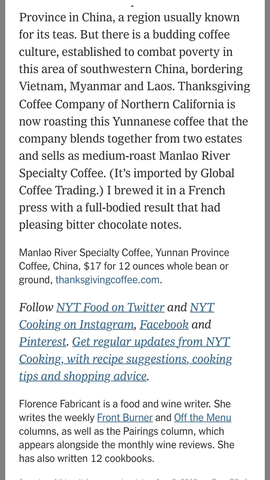 “这款单一产地咖啡是最近从通常以茶闻名的中国云南引进的。在中国西南这个与越南、缅甸和老挝接壤的地区,为了消除贫困而建立起来的咖啡文化正在产生萌芽……作为中度烘焙的曼老江精品咖啡在美国进行销售……我在法压壶里制作了这款咖啡,它带有饱满的醇度以及令人愉悦的黑巧克力口味”。在2018年8月8日的《纽约时报》上,著名美食专栏作家Florence Fabricant这样写道。