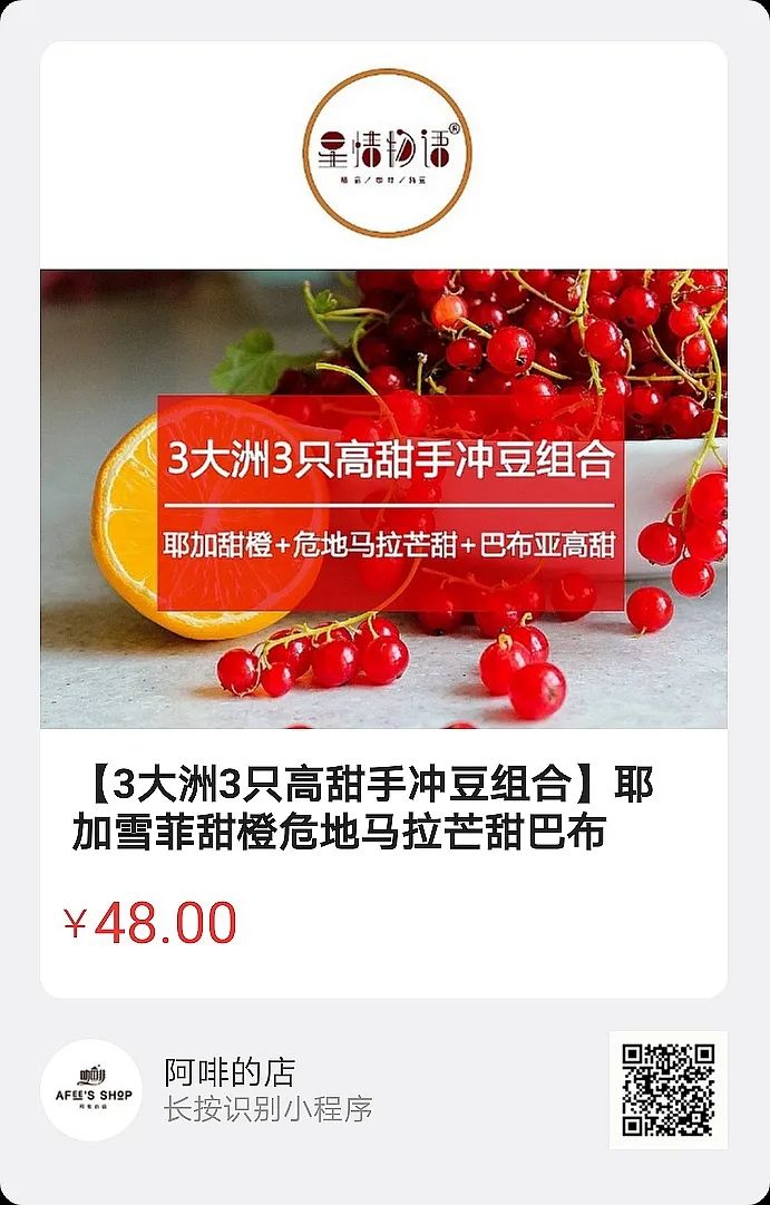 为了让大家能更明显的感受到咖啡的天然甜感我们从阿啡的店微店中挑选了3只回购率高/水洗或日晒天然处理的口粮豆【非洲】埃塞俄比亚耶加雪菲甜橙水洗豆【美洲】危地马拉芒甜日晒豆【亚洲】巴布亚新几内亚高甜水洗豆以组合特价的形式分享给热爱手冲精品咖啡的你3包各100克组合价低至99元请长按下图识别二维码速度入手