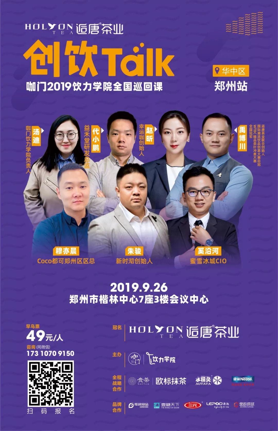 长按识别上图二维码,可立即报名2019年,咖门上线创饮Talk全国巡回课项目。选了五个城市,关联五大区域,辐射全国饮品行业。目前,创饮Talk已经走过上海、深圳、北京、成都四站,500人规模。第五站华中站,9月26日,落地郑州,是收官之作。导师阵容已经确定:新时沏创始人朱骏、CoCo都可郑州区区总穆亦晨、蜜雪冰城CIO奚沿河、益禾堂研发总监代小鹏、幸运咖创始人赵昕、逅唐茶业联合创始人禹博川将现场分享品牌、产品、运营的经验和心得。此外,郑州站相较前四站,还有一枚彩蛋——咖门饮力学院负责人汤迪将现场解读2019饮品行业数据报告。用行业数据承载事实,洞察消费者喜好,把控发展趋势。