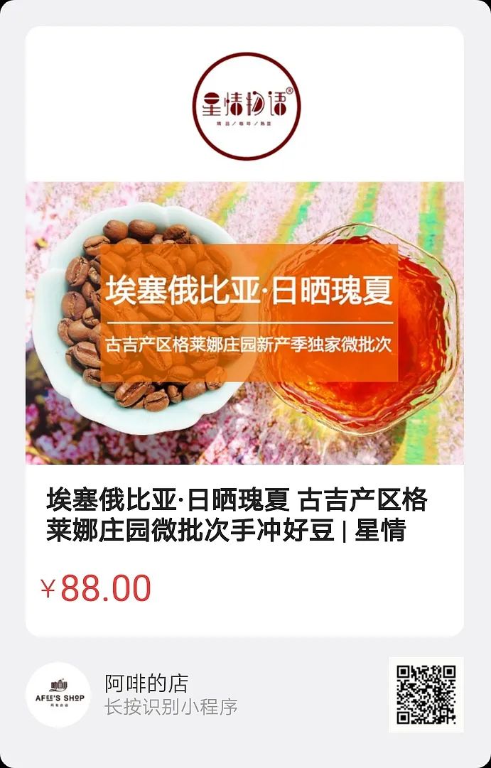 阿啡的店微店近期最收欢迎的星情物语 | 精品咖啡熟豆埃塞俄比亚·日晒瑰夏古吉产区格莱娜庄园微批次手冲好豆水果香气华丽&甜感强烈持久150克装88元轻松到手可做10杯手冲咖啡平均每杯8.8元当口粮豆天天喝瑰夏每天都是好星情请长按下图识别二维码速度入手