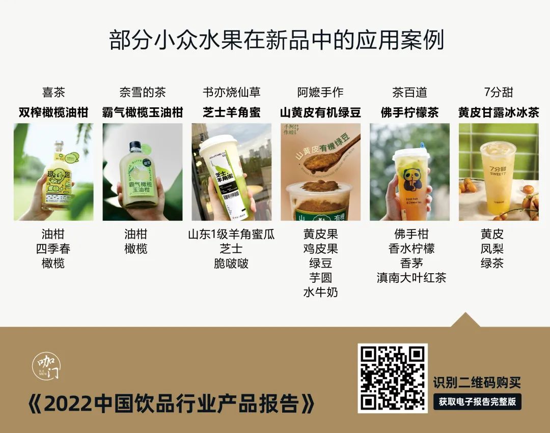 可以看出,产品回归初心,用基本的结构做纵向升级、提升品质和口味的趋势在加强。3、“新物种”持续被开发- 小众水果获大众认知2021上半年油柑的爆红,拉开了小众水果流行的序幕。油柑、黄皮、橄榄等多种小众、区域性水果被开发应用,甚至影响供应链,油柑价格大涨,部分地区也由此开始油柑种植。在统计59种水果的使用频次中,油柑共出现31次,黄皮出现18次,分别排在水果使用量的第15、第20位。而取样的40个茶饮品牌中,有11个品牌推出了油柑产品,9个推出了黄皮产品,均有1/4左右的品牌在使用。