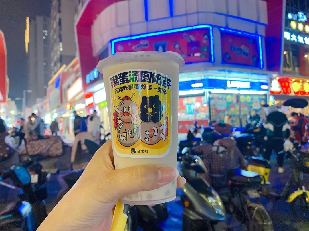 从IP角度分析,相比于蜜蜂,熊的形象曾经出过很多爆款,比如熊本熊、布朗熊、熊大熊二等,以熊作为品牌符号,与消费者进行情感链接,辨识度更高。- 物料、文案处处有心机,提升效率元宵节期间,甜啦啦每家店吧台上,都有一个横幅“元宵吃黑蛋,好运一整年”,推荐的是一款以熊黑蛋命名的汤圆奶茶,这种类似谚语的产品口号,能促进顾客做出进店决策。顾客点单时,菜单上方文案“90%土豪加了1元椰果,剩下的10%加了2元”画风俏皮,又能轻松提升1~2元客单价。