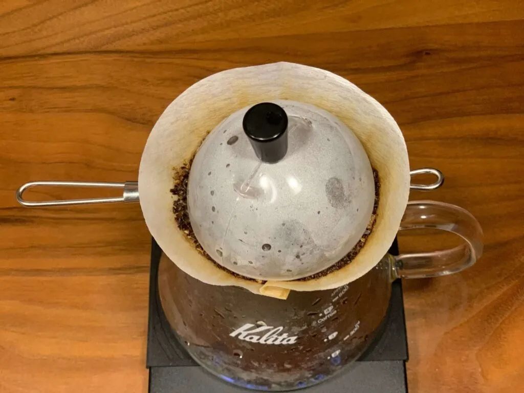 2、松屋式的闷蒸很有意思,他的理念是让咖啡粉里的空气排得一干二净,这样无论是新鲜烘焙的咖啡豆还是烘焙一个月的咖啡豆,冲出来的咖啡味道都要一样。他的做法是把咖啡粉研磨到很粗,然后注水焖蒸3分钟,在闷蒸期间还要盖上盖子,以确保在焖蒸期间咖啡的大部分香气不流失。