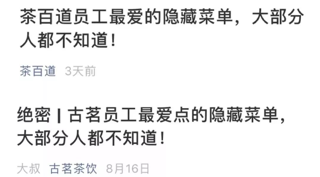 茶百道、古茗公开“隐藏菜单”,图片截取自公众号传播范围广,影响深远,不花成本,被曝光的“隐藏菜单”就是在闷声给品牌收割免费流量。有一定的粉丝基础后,谁不愿意试试呢?-02-“隐藏菜单”:一项公开的营销手段