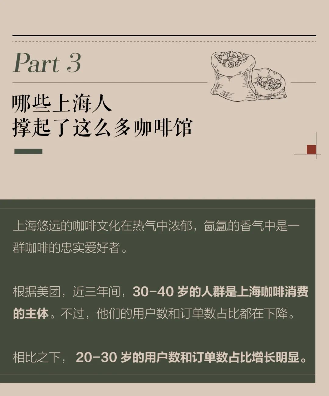 结语作为世界三大饮品之一的咖啡,在中国的地位一直不高,但上海市民对咖啡接受度之高,其他城市望尘莫及。早在十九世纪八十年代,上海就开出了第一家独立营业的咖啡馆。从此,上海市民再也离不开这种黑色的苦味饮料。独特的咖啡文化使得这座城市的咖啡消费也呈现出自己的风格,上海不仅可以容纳下大量商业连锁化的咖啡品牌,而且拥有众多风格独特的独立咖啡馆,它们已经融入了这座城市的烟火日常。感谢美团的数据支持,让我们了解了上海这座城市的咖啡风情:1、上海是全中国拥有最多咖啡馆的城市,每万人咖啡馆数量也最多。2、上海人喝咖啡的习惯可以追溯到上海开埠的 1843 年,外国人的涌入带来了咖啡,这也是上海咖啡文化浓厚的历史原因。3、上海的咖啡消费人群以女性为主,30-40 岁的人群是咖啡消费的主体,但 20-30 岁的用户数和订单数占比在增加。4、比起独立咖啡馆,连锁咖啡馆集聚程度更高,更偏向于商业和消费活跃程度高的区域开店。5、独特的口感和环境、风格,是大家想去独立咖啡馆消费的重要原因。6、经营一家独立咖啡馆的梦想不好实现,成本非常高,又受到新式茶饮的挤压。