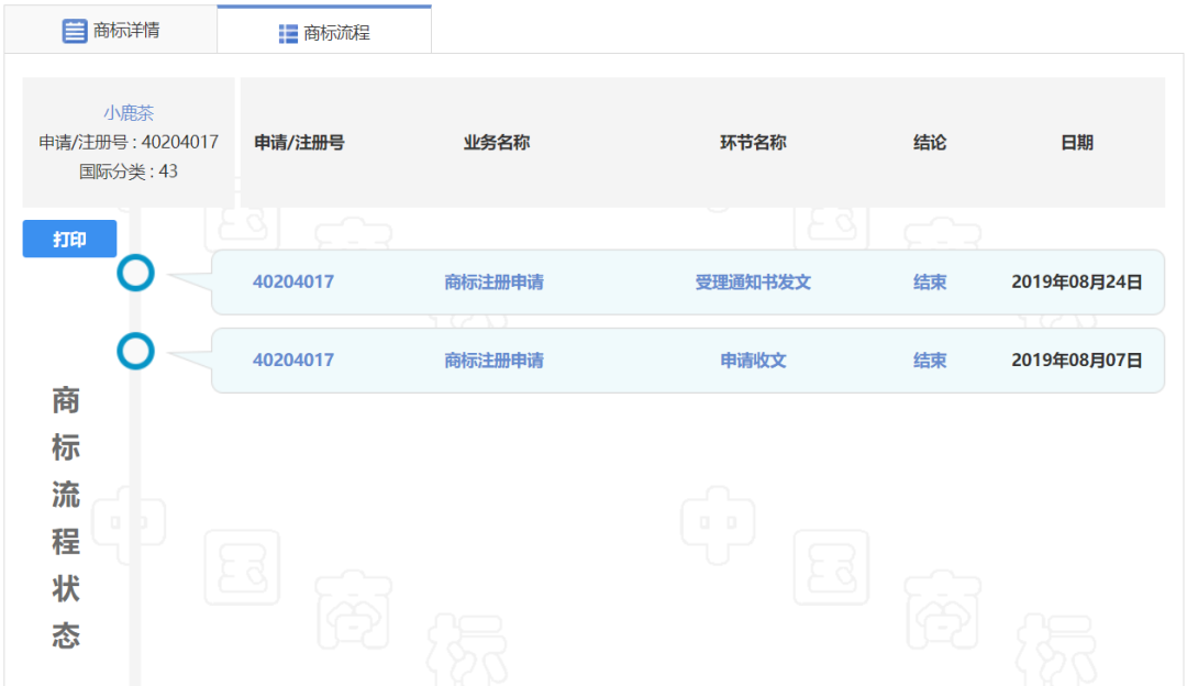 小鹿茶商标8月24日受理通知书发文,图片截取自中国商标网
