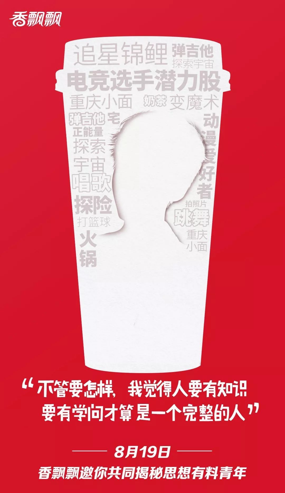 活动海报,图片来自@香飘飘之后几天里,@香飘飘更是发布了一系列的海报以及代言人信息爆料,这是谁家的idol呢?14日,情报第一弹,“一边低调有礼,一边肆意生长,他用努力和坚持不负天分,用幽默和善良赢得喜爱,简单纯粹,暖心有料。”