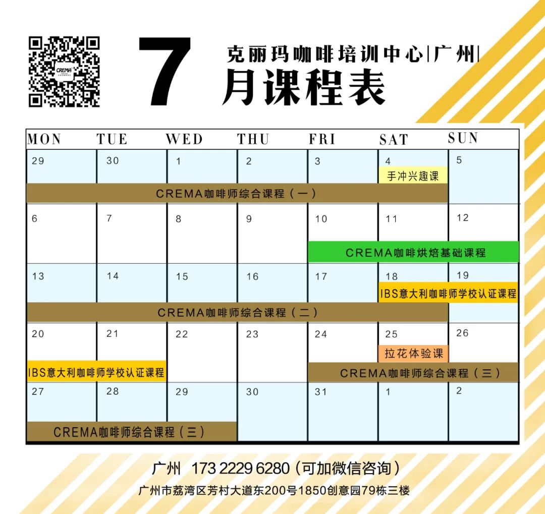 CREMA 咖啡师综合课程(上午10:00-12:30 下午14:00-17:00)开课时间(一):6月29-7月4日开课时间(二):7月13-18日开课时间(二):7月24-29日导师:钟标强、卢嘉伟收费:4800元/人课程介绍:CREMA咖啡师综合课程IBS意大利咖啡师学校认证课(上午9:30-12:30 下午13:30-17:00)开课时间:7月18-21日导师:钟标强收费:6500元/人课程介绍:IBS意大利咖啡师学校认证课程咖啡烘焙基础课程(上午:10:00-12:30 下午14:00-17:00)开课时间:7月10-12日导师:卢嘉伟收费:3500/人课程介绍:CREMA咖啡烘焙基础课程手冲兴趣课(上课时间:14:00-17:00)开课时间:7月4日特惠价:180元/人课程介绍:零基础精品咖啡冲煮及品鉴课拉花体验课(上课时间:14:00-17:00)开课时间:7月25日特惠价:280/人课程介绍:家用咖啡机教学&咖啡拉花体验课