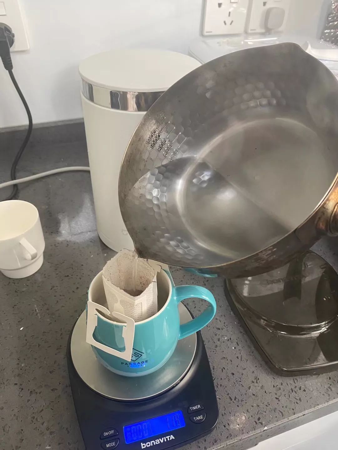 温馨提示:物流断了的日子,先美团上看看哪家咖啡馆有挂耳外卖,可以解燃眉之急。现在这个无法实现咖啡自由的时候,大佬们也总有办法绝处逢生。晓博大佬咖啡的器具都在工作室里,于是在厨房里用锅烧水,冲起了挂耳。这个水流看着就很稳。