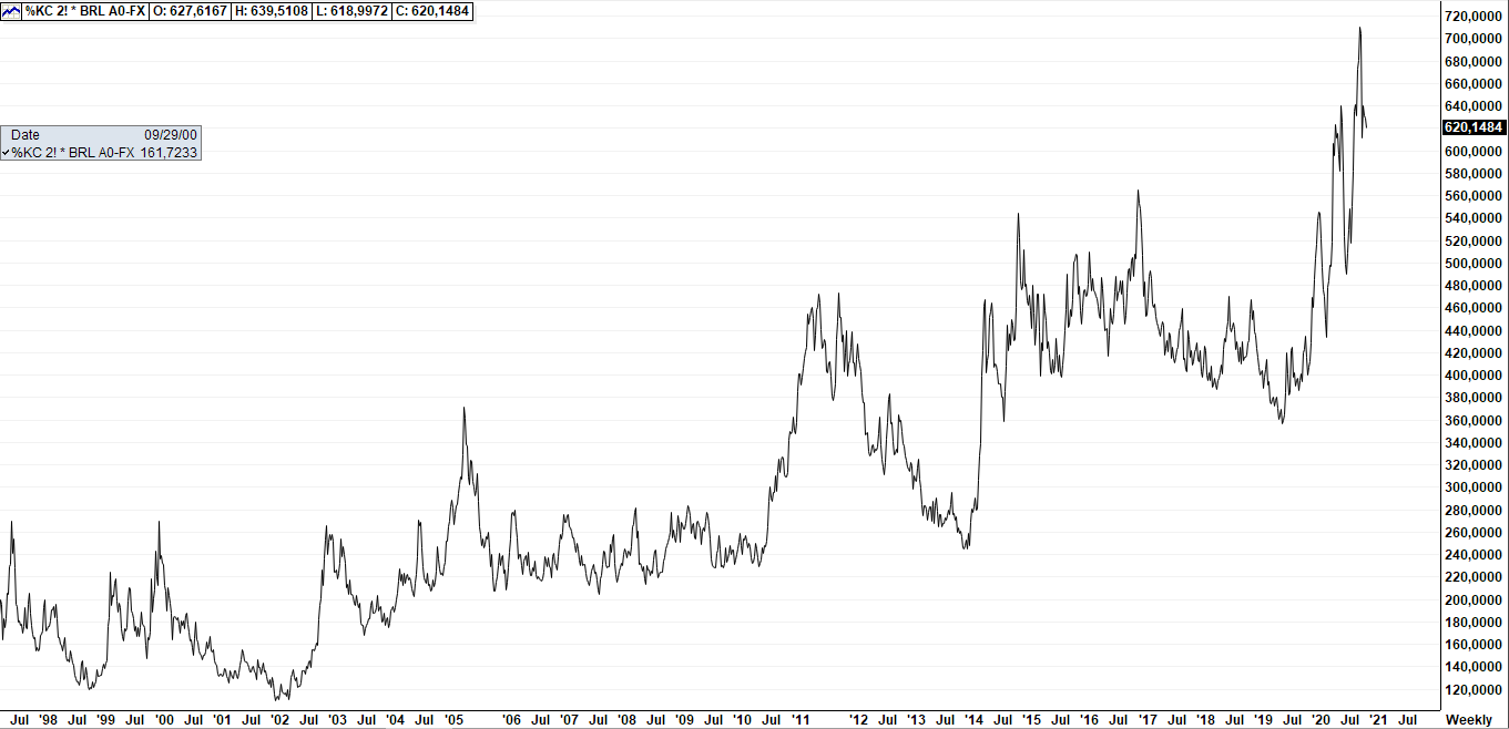 下图为:1998年8月至今巴西国内咖啡现货价格走势