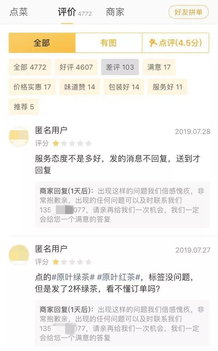 做服务、提高门店质量,打造综合实力总体来说,提高外卖销量,需要综合作用力。比如在门店曝光量上,据郑州慢茶线上负责人介绍,外卖平台有自己的判定标准,会根据门店质量提高曝光度。门店质量考核的标准在于门店星级标准、好评率等,甚至营业时间长,也是优势。比如普通门店营业10个小时,你能运营14个小时,质量也高一点。在线上,服务同样重要,慢茶安排专门的岗位策划外卖推广活动、回复留言互动、展示和调整产品等。蜜雪冰城国贸店的外卖评价栏里,也能频繁看到评论回复。对于差评甚至给出反馈电话。所以啊,哪有随随便便的成功,分明是做好了所有准备。