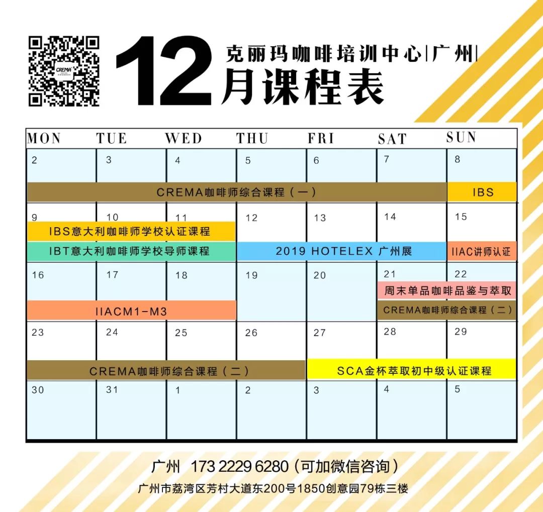 CREMA 咖啡师综合课程(上午10:00-12:30 下午14:00-17:00)开课时间(一):12月2-7日开课时间(二):12月21-26日导师:钟标强、卢嘉伟收费:4800元/人课程介绍:全面优化 | CREMA咖啡师综合课程咖啡基础入门班(上午10:00-12:30 下午14:00-17:00) A. 单品咖啡品鉴与萃取开课时间:12月21-22日收费:1200元/人IBS意大利咖啡师学校认证课程(上午9:30-12:30 下午13:30-17:00)开课时间:12月08-11日导师:钟标强收费:6500元