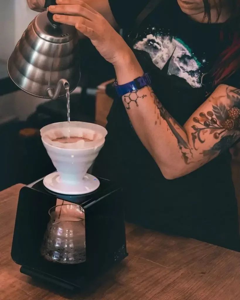 使用V60冲煮咖啡。来源:KinimaCoffee 低因咖啡一定要用深烘焙呈现吗? Matt说:「经过去因程序的咖啡豆,本身会有更多细孔因而更容易受热,烘豆师在烘焙时也因此需要做些调整。咖啡风味的发展需要更长时间,意味烘焙时间需要更久。上述提到处理程序造成的风味耗损,若将低因咖啡豆以浅烘焙呈现,会导致缺乏风味、风味分散、甜味与酸质不足的问题。替代方案就是透过较深的烘焙,将咖啡豆焦糖化而产生另一种风味特性与甜感。」