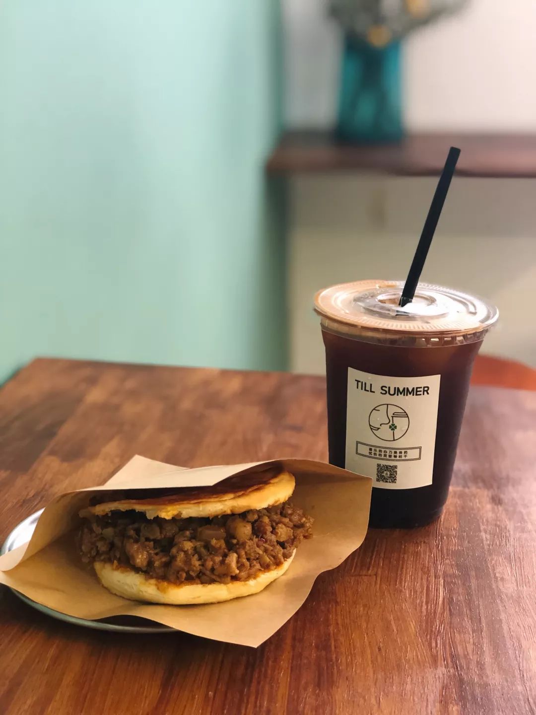 老板本身很喜欢喝咖啡,开店之前也去了很多城市探店,看看别人家的社区店是怎么经营的。在武汉一家店,看到有提供热干面配咖啡,于是就想在店里也卖点日常食物,因为妻子是陕西人,于是店里就多了一项特殊的点心——肉夹馍。9.9元的肉夹馍,和在西安吃到那种馍的嚼劲不太一样,Till Summer的馍是脆的,而且夹的也不是炖肉,是微辣的臊子,夏天里搭配一杯醇厚的冰美式,很畅快。