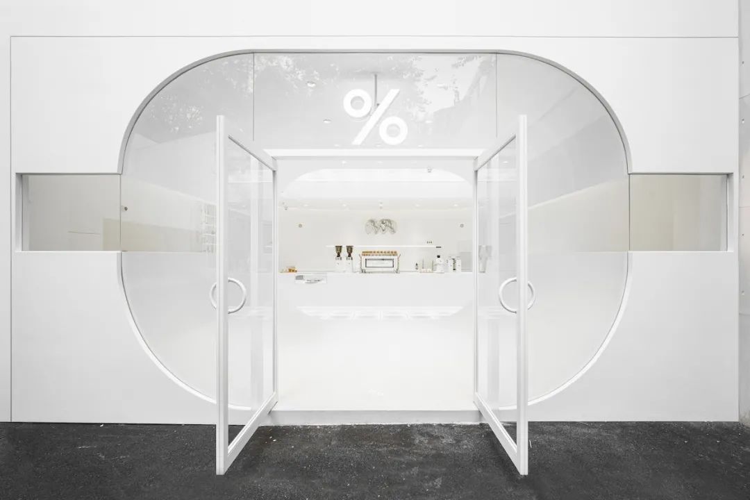 商店的镜面结构通过 %Arabica 特有的可丽耐台面和立面、隧道的白色灰泥饰面以及设计为尽可能不可见的玻璃立面而变得连续,促进了简单性和流动性。