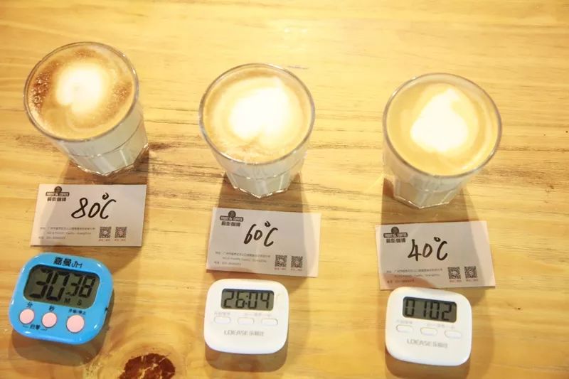 80℃的情况是:泡沫很粗,杯壁的奶泡消的比较明显,泡沫图案稍微有点扩散。消泡时间2分30秒左右60℃的情况是:泡沫消到一定程度后变化不到,奶泡还是很密集的看到细小的泡眼。奶泡的图案会有点往外扩散和80℃差不多。消泡时间6分15秒左右40℃的情况是:泡沫消到一定程度后变化不到,奶泡比60℃的略粗一点,奶泡图案扩散的比较明显。消泡时间在3分45秒左右