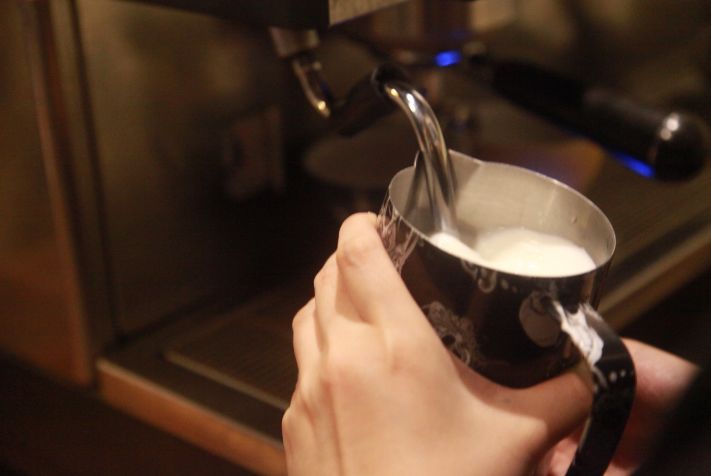 90℃的情况是:在超过70℃左右的时候奶泡即使不去刻意发泡,泡沫也会迅速膨胀,温度高不断翻滚,快到90℃时小编的牛奶已经溢出奶缸了(如上图),停止在94℃。1分30秒左右已经出现明显的消泡痕迹。60℃的情况是:这是我们比较常用的温度,按照常规的操作打发奶泡,感觉烫手停止,温度在63℃。10分50秒左右出现明显消泡痕迹。30℃的情况是:按照常规手法发泡,手感温度是温暖,停止温度在33℃。4分20秒左右出现明显消泡痕迹。12℃的情况是:这我们是直接用冰箱的牛奶,使用手动打发器,倒入打发器的温度是8℃,打发后的温度是12℃。5分15秒左右出现明显消泡痕迹。观察完奶泡后,小编又选择了三个温度的奶泡放到咖啡里面进行对比。小编用前街的精品意式咖啡豆进行测试,(烘焙程度:中深烘焙;咖啡豆:100%阿拉比卡哥伦比亚4:巴西6的拼配比例)。意式浓缩咖啡:40克,萃取时间:25秒。