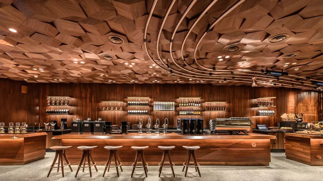 天花板雕塑由1876个手工切割木块制成,隐约看到星巴克的标志图案▼