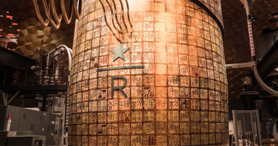 40吨的铜桶,上面覆盖着1000块手工雕刻的传统中国铜板,用汉字讲述星巴克的故事,通过气动管连接到咖啡吧。