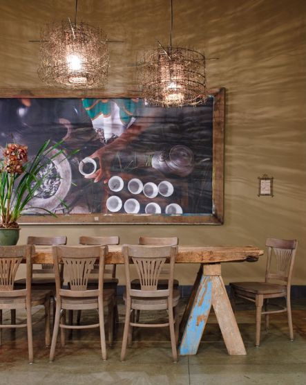 桌椅是来自当地剧院和其他星巴克经过修补重复使用。其他木饰面来自海边拆除的谷仓。桌子的木材来自一艘旧帆船,壁画由当地艺术家创作。