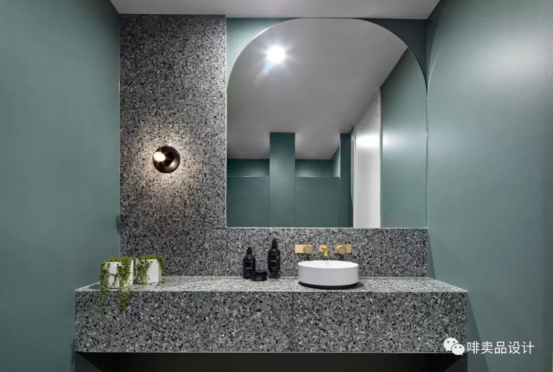 在空间中添加活泼粉色与米白,配上如墨水般纹理独特的水磨石地板,为空间的刚硬棱角优雅软化了几分。