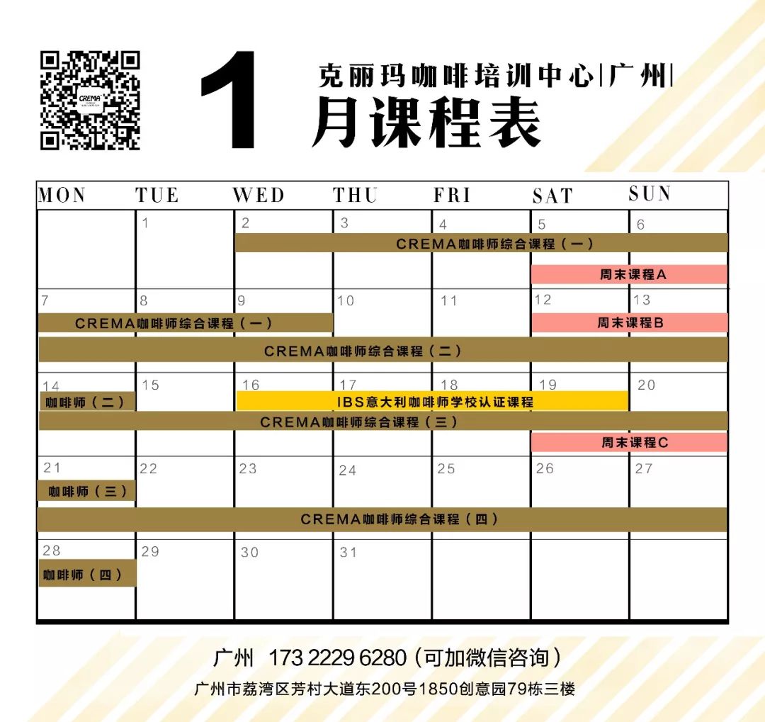 CREMA 咖啡师综合课程开课时间(一):1月2-9日开课时间(二):1月7-14日开课时间(三):1月14-21日开课时间(四):1月21-28日导师:钟标强、赵荣杰、卢嘉伟收费:4800元/人周末咖啡全能班A. 单品咖啡品鉴与萃取开课时间: 1月5-6日收费:1200元/人B.意式咖啡研磨和萃取开课时间:1月12-13日收费:1500元/人C.咖啡拉花基础课程开课时间:1月19-20日收费:1500元导师:钟标强、赵荣杰、卢嘉伟IBS意大利咖啡师学校认证课程开课时间:1月16-19日导师:钟标强收费:6500元课程咨询