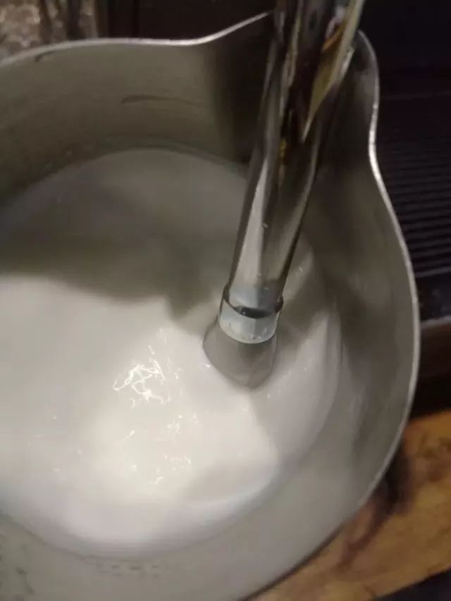 而且建议使用冻牛奶会比较好,因为对于大多数新手来说,对于打奶泡的过程掌握不够熟练,所以需要长一点的时间来对奶泡进行打发和打绵(下面会解释什么是打发和打绵),所以,在0——5°C左右的冻牛奶,其加热时间是最长的,有足够的时间给新手调整角度,控制漩涡。