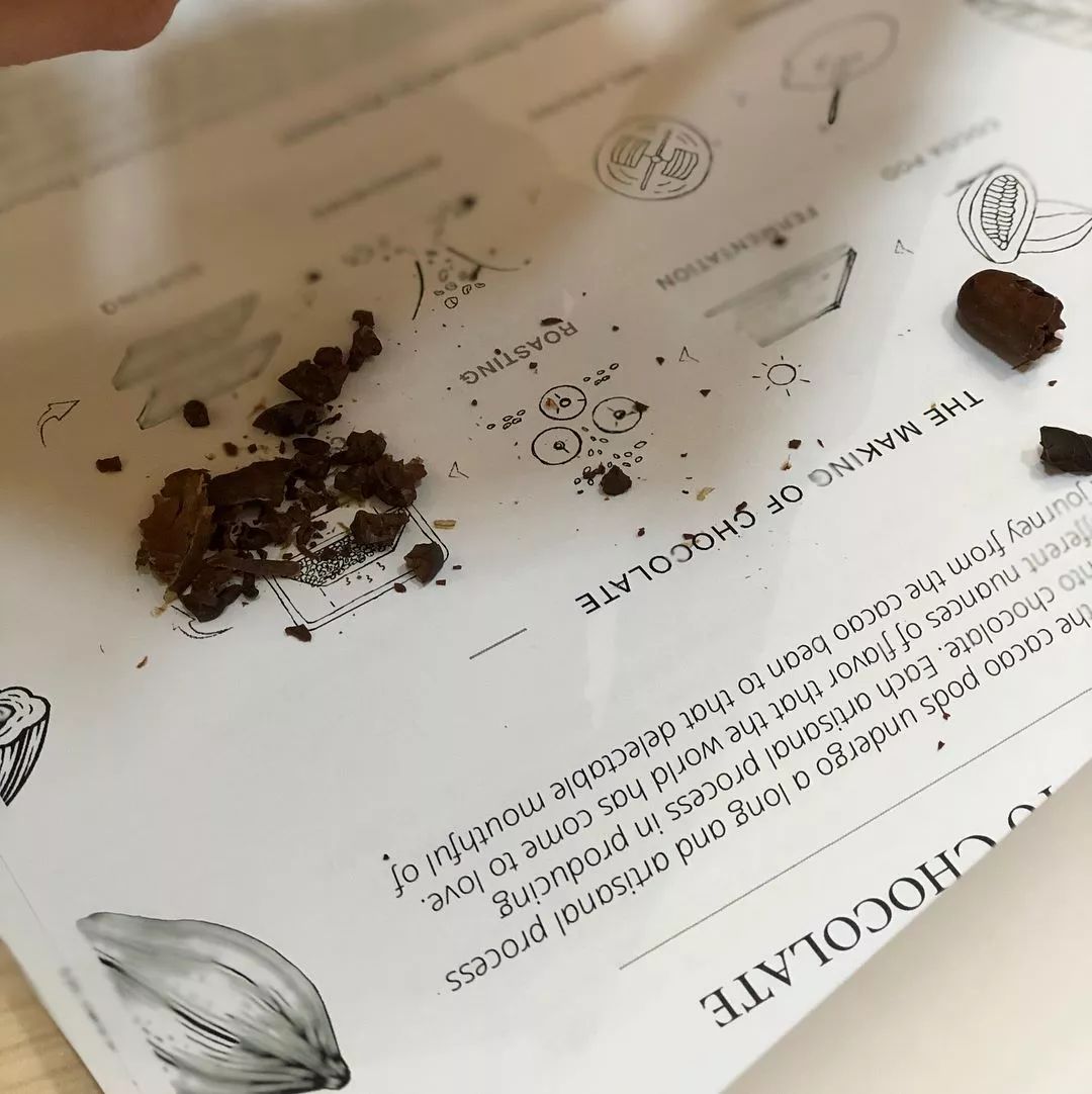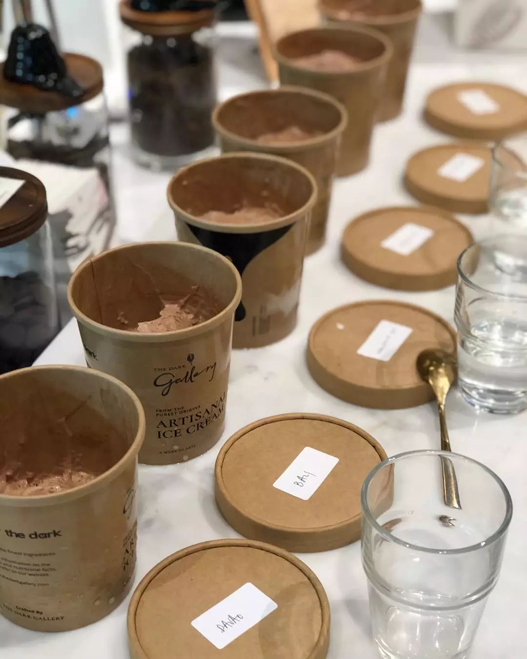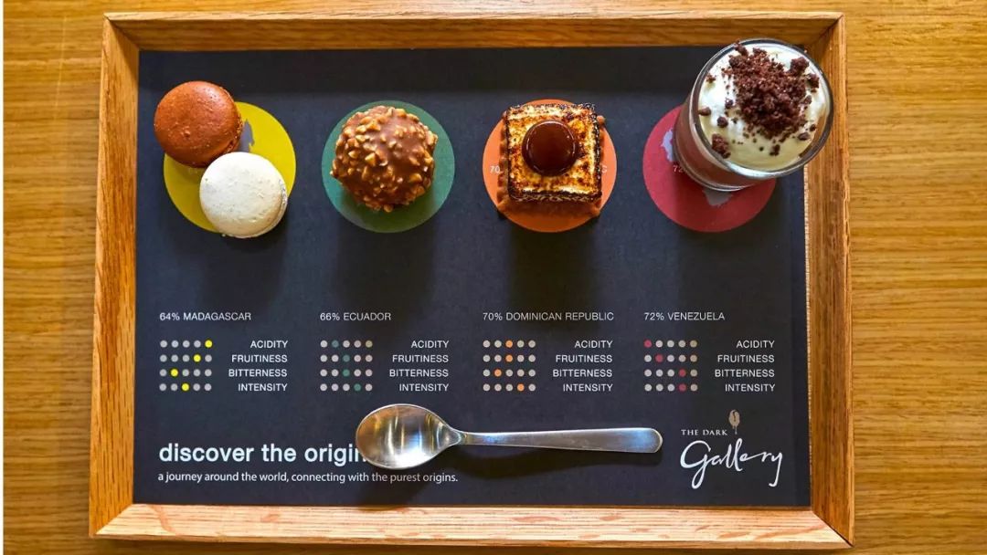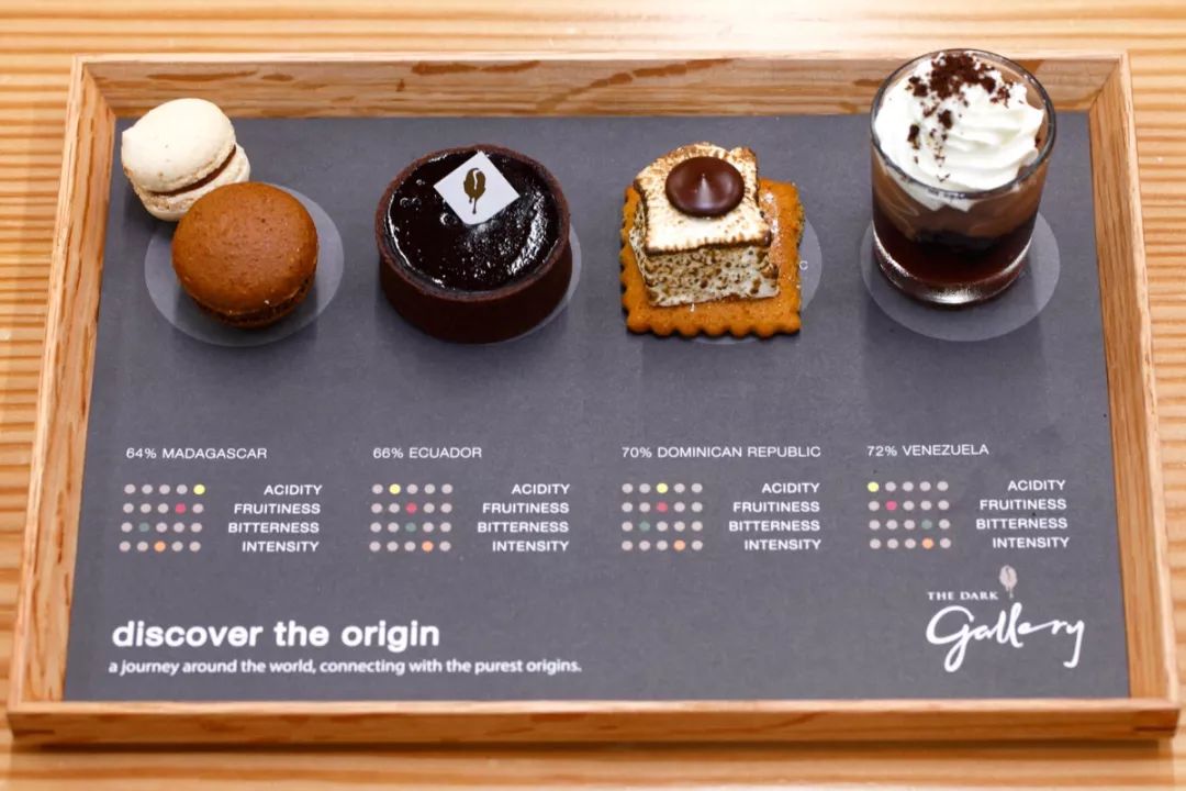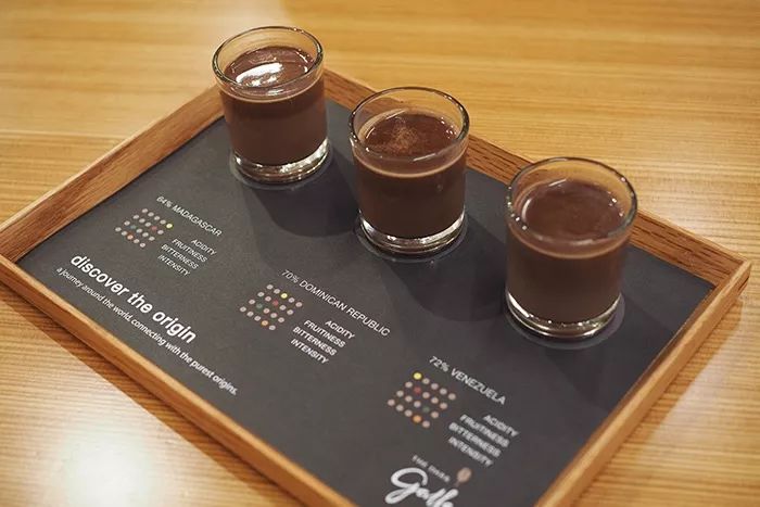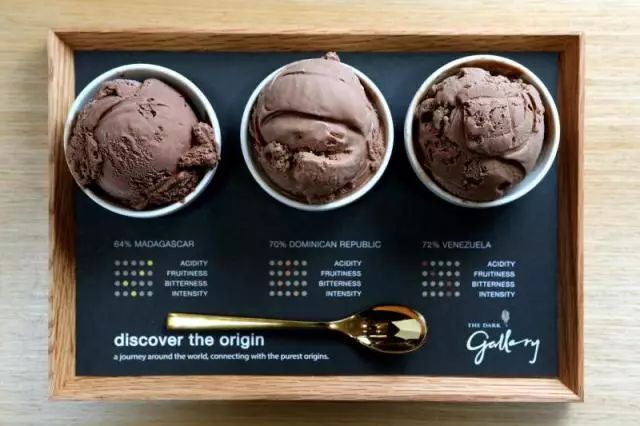 的单品巧克力雪糕试味盘,让你在品尝三款单品黑巧克力的同时,了解它们的特质。 有趣的是,形容单品巧克力口感的方式跟单品咖啡类似,可分:酸度、果味、苦味和浓度指数。例如:葡萄柚的果香味、花香味、微辣、带酸、偏苦。