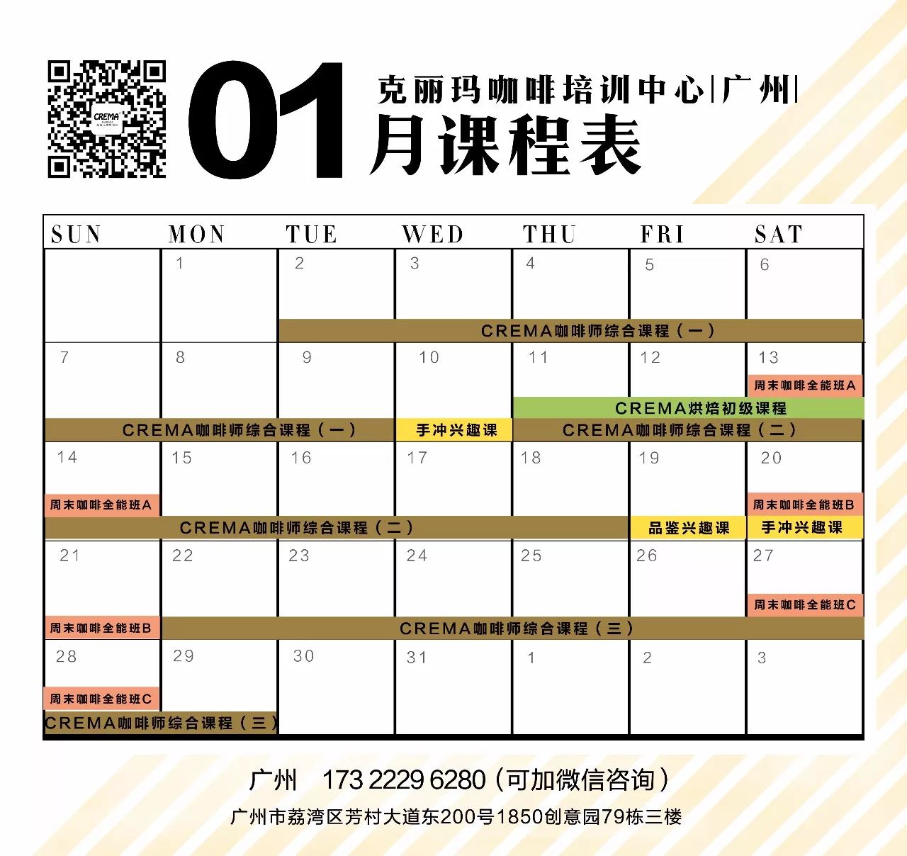 CREMA 咖啡师综合课程开课时间(一):1月2-9日导师:赵荣杰开课时间(二):1月11-18日导师:钟标强开课时间(三):1月22-29日导师:卢嘉伟收费:3800元/人周末咖啡全能班A. 单品咖啡品鉴与萃取开课时间:1月13-14日导师:赵荣杰收费:1200元/人B.意式咖啡研磨和萃取开课时间:1月20-21日导师:钟标强收费:1500元/人C.咖啡拉花基础课程开课时间:1月27-28日导师:赵荣杰收费:1500元周末咖啡全能班优惠方案:A+B+C 原价4200元,现优惠价3800元。CREMA 烘焙基础初级课程开课时间:1月11-13日导师:卢嘉伟收费:3000元/人CREMA兴趣课程1、手冲咖啡兴趣课程开课时间(一):1月10日 14:00-17:00导师:钟标强开课时间(二):1月20日 14:00-17:00导师:赵荣杰收费:180元2、咖啡品鉴兴趣课程开课时间:1月19日10:00-13:00导师:李陶收费:180元