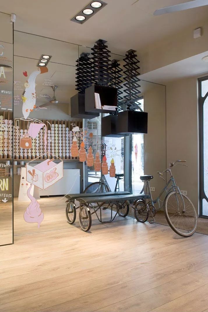 这家Rocambolesc冰淇淋店位于西班牙赫罗纳,由Marcia Argyriades于2013年设计完成,曾获得“欧洲最佳酒吧”大奖。设计师受传统无轨电车的启发,将充满戏剧特色的设计手法引入这家店面的装饰之中。推开一扇不大的玻璃门,便进入到店内,映入眼前的便是以红白相间的PVC管道为代表的传统与现代相融合的设计风格。木地板、老旧的仪表盘以及排列整齐的木质搁架,上面则摆放着一排排让人食欲大动的奶油和食材。一部由自行车改装而成的旧人力车则静静地停放在角落里,提醒着人们已经流失的岁月。