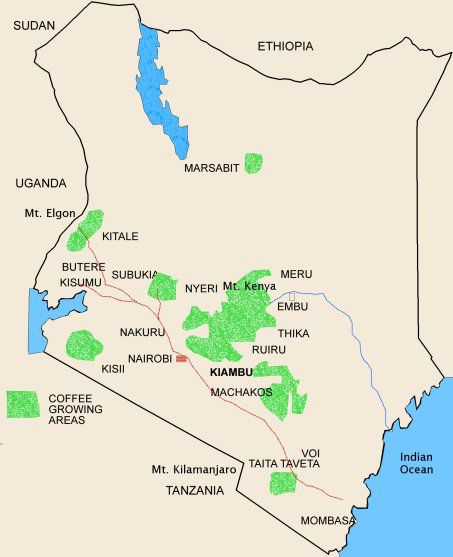 “肯尼亚”是咖啡主要生产国之一,全国约有六百多万人口从事咖啡产业,多为小农、湿式处理厂和合作社的结合的形态。肯尼亚咖啡以水洗处理法为主,咖啡树多栽种于海拔1400米-2000米的山区,产区有Ruiri, Thika、 Kirinyaga、 Mt. Kenya West、 Nyeri、Kiambu 和 Muranga。肯尼亚有名的产区大多集中在中部,例如﹕Nyeri、Kiambu、Kirinyaga和西部近乌干达的山区(Nakuru、Bungoma、Kitale等)Kiambu产区介绍:海拔:1500-2200m收成:一获期:10月——12月、二获期:6月——8月品种:SL-28, SL-34, Batian 肯尼亚咖啡种植 咖啡农庄大多是年产数百公斤的小规模经营。他们会应输送距离和收购价决定将果实售予邻近的处理厂(Coffee Factory)。农民们拥有的土地面积很小,通常会用一片土地上树的总量来测量土地面积大小,这意味着生产者经常能有更多的自主权来战略性地采摘咖啡鲜果,并且能向当地的工厂(水洗处理厂)运送最成熟的咖啡鲜果。工厂一般有丰富的水资源进行精细的水洗处理,包括将咖啡豆长时间浸泡在淡水中,以巩固特有的肯尼亚的风味特征。
