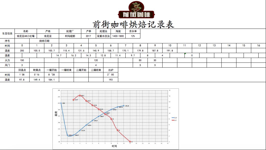 04 | 烘焙分析 这款咖啡的颗粒比较小,且密度中等,本身含水量不高。烘焙目标是浅中烘左右,不同于其他肯尼亚的浅烘,这支小红莓采用浅中烘降低酸味的强度,能提升质感与均衡度,整体表现得更加甜蜜多汁。在第一批次烘焙中,下豆温度比较高,入豆温度200度,火力也相对较大。在烘焙过程中,发现这支豆子的海拔相对不算高,豆质稍软,于是采用了逐步降火、稳定爬升的烘焙手法,在豆子进入转黄点、脱水完毕、一爆前兆分别调细火力,避免豆表灼伤,并稍微拖长一爆时间,增加焦糖化反应时间,提升风味的质感与均衡度。