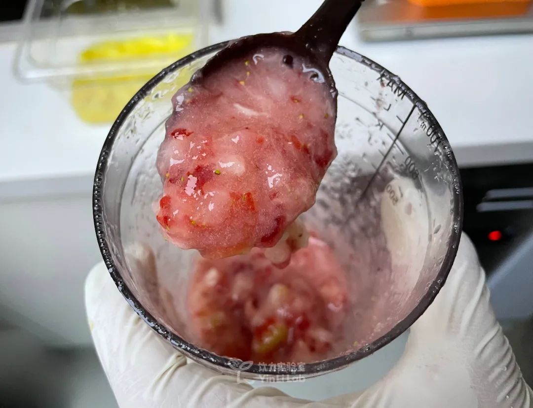 和草莓类似,最小块时,人工和机器同样捯压15秒,捯捶效果相似,甚至机器捯锤更均匀。