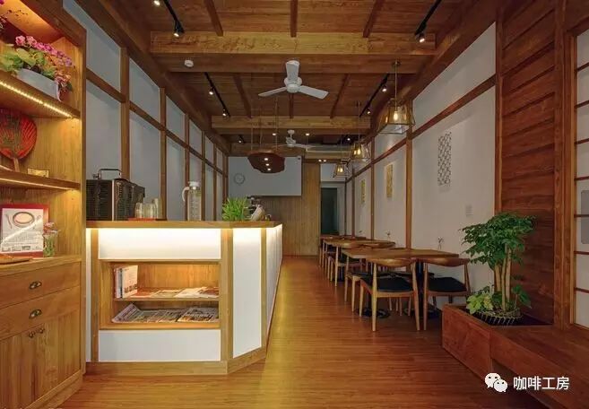 日式咖啡厅风格装饰设计老宅子怀旧风情 设计师从整修过的老宅子入手,在崭新空白的框架中,创造深厚的怀旧日式风情。以大量的木质搭构造型元素,由店面的木格窗拉门、到全空间以木质、天然矿物漆铺展的日式简约线条,不大的空间中,长形的吧台战区空间的1/2,原先能够置入16张桌椅的空间,以日式廊檐造型提供顾客等候、吃冰淇淋的暂歇座位,仅剩12个座位的咖啡厅,是老板期盼给顾客如回家一般的亲切感
