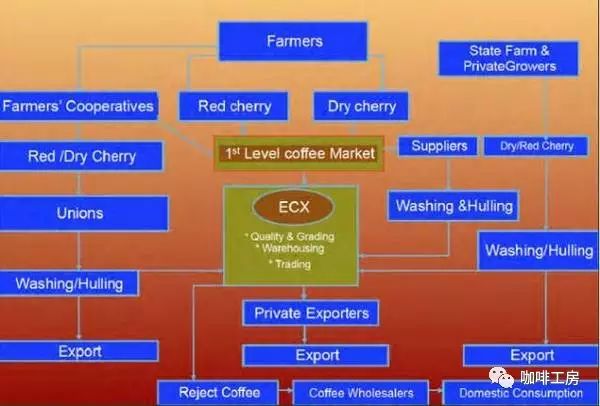 图埃塞咖啡供应链来源William Boots 如果我们想采购埃塞的咖啡,渠道一般有3个 ●农户合作社联盟(咖啡来自下属的合作社、小农) ●出口商(中介,从ECX或者各地的咖啡市场采购) ●大的公有或者私有种植庄园(咖啡自产自销的出口商) 这里我们对农户合作社联盟和ECX做些简单的解释Farmers’ Cooperative Unio
