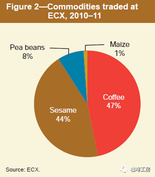 图 ECXlogo来源ECX 2008年3月,埃塞成立了埃塞国家商品交易中心(ECX Ethiopia Commodity Exchange),咖啡作为其中主要交易品项之一,占据了近一半的交易份额。