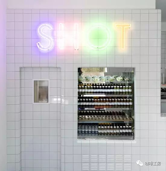 瓷砖墙面无缝蔓延,将不同的元素整合到一起桌子的设计与盛放植物的容器整合到了一起,这样可以在桌子上养一些香草和辣椒,以强调食品供应的透明性。长凳的胡桃实木座面使用数控机床模仿了瓷砖间的灌浆线和斜切边。这家咖啡馆位于一家杜松子酒酿造厂和一家自营裁缝店之间,其外立面纯白、简洁,在这条个性鲜明的伦敦小巷中形成了一道独特的风景。