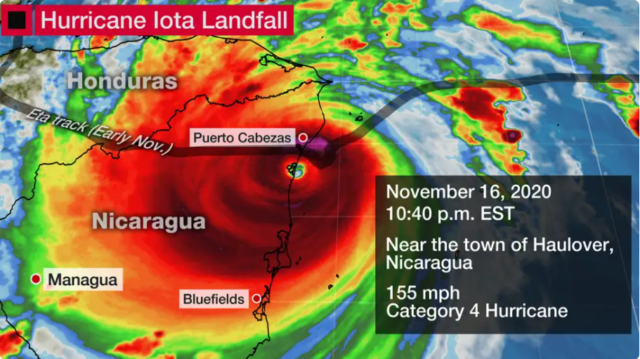 11月16日,新的飓风Iota正式在尼加拉瓜登陆,登陆时给当地带来113英里/小时的阵风,并且预计将给洪都拉斯,尼加拉瓜,危地马拉和伯利兹的部分地区可能带来10至30英寸的降雨,再度造成这些地区的洪水。
