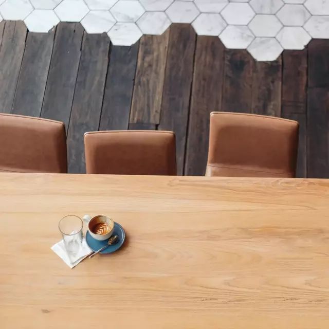 墙面和天花都用了白色油漆,没有过多装饰。桌椅都是简单的木材款式,让空间多了一点温暖的氛围。坐垫也多为皮革,舒适中带点优雅。
