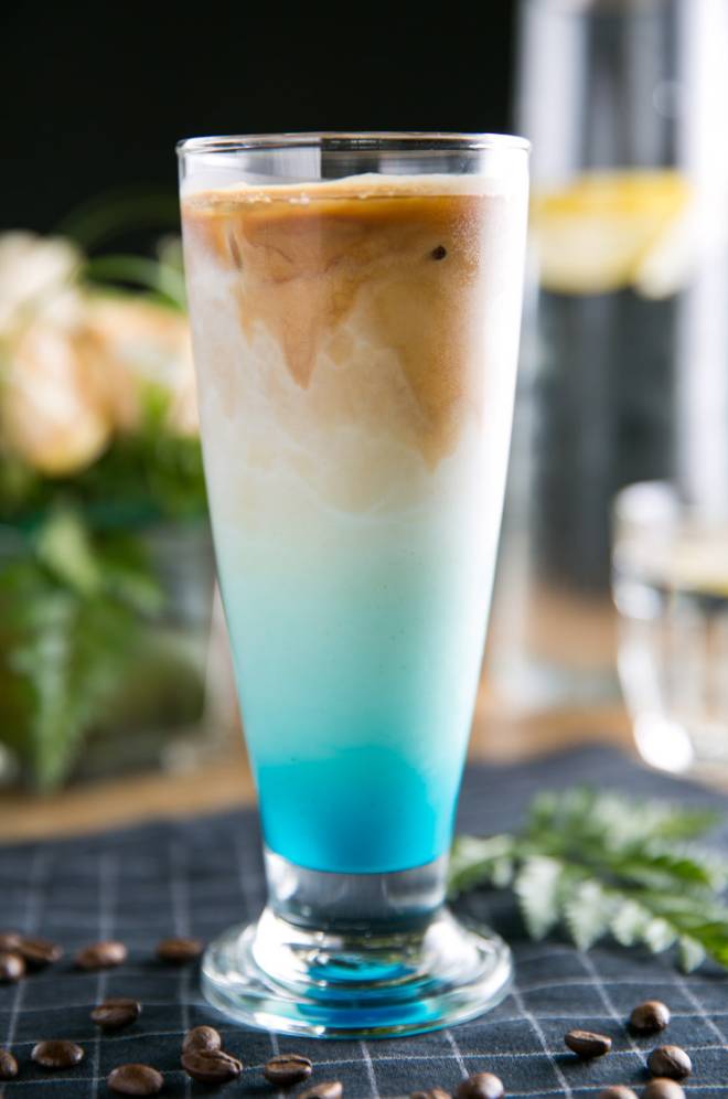 这款海洋拿铁,仿佛把湛蓝的海水和蓝天白云一同装进了拿铁里,光是渐变系的海洋色就足够掳获一大票少女心!喝前记得搅拌一下哦~