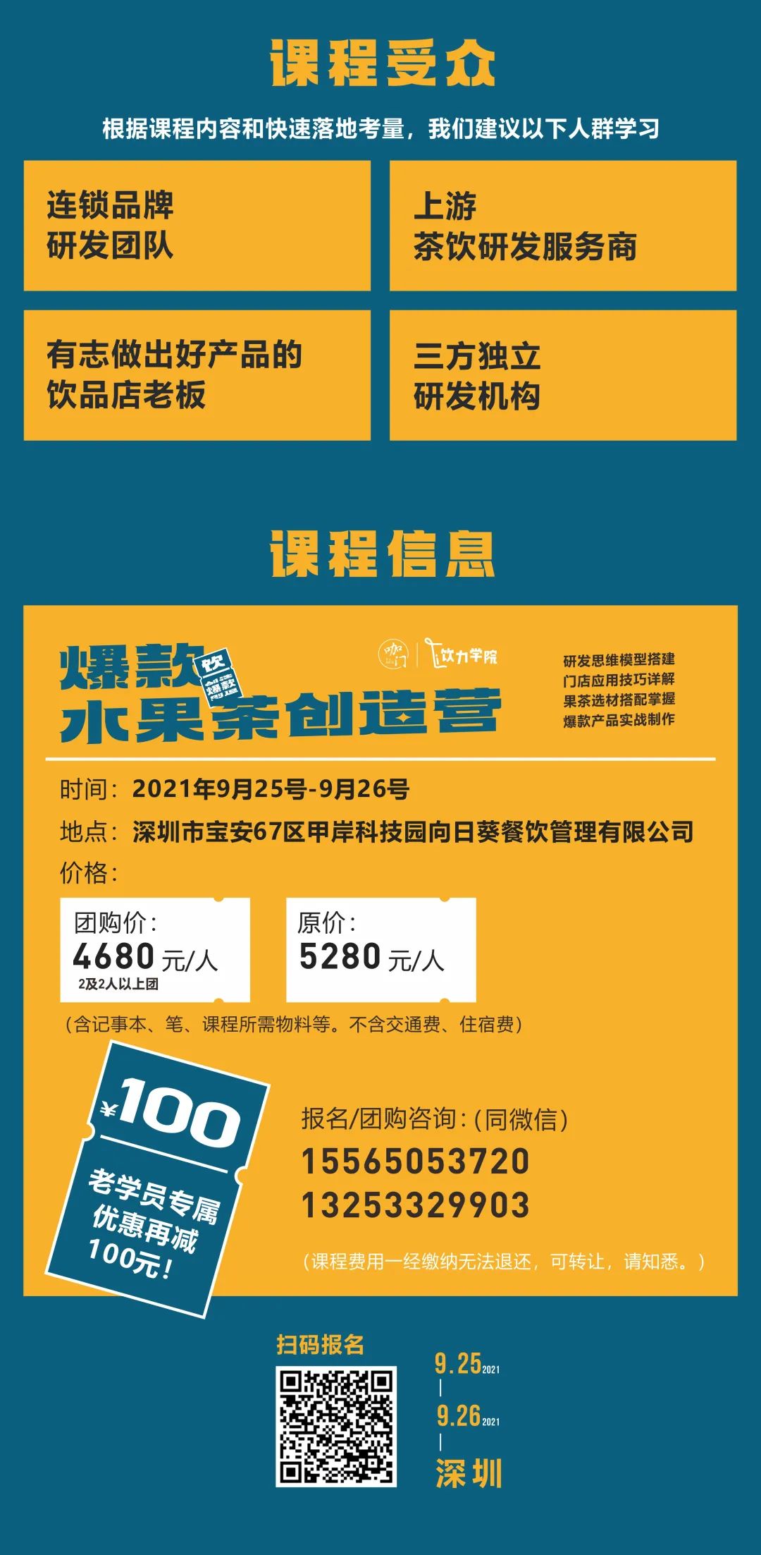 这次特别重实践我们邀请奈雪的茶研发总监张胜斌、1柠1柠檬茶创始人黄启成开设《爆款水果茶创造营》课程,通过2天知识+实践1:1的学习,弄清水果茶研发的逻辑和思路,上手做一杯好喝的水果茶。1.理论与实践1:1,真正掌握爆款水果茶制作方法此次课程我们根据学员际需求,放大实践环节。将用两个下午,让学员亲身参与到创意水果茶的方案设计与吧台实现中来;切实练习、制作多款今年经典/爆款柠檬茶。讲师将现场示范、点评与优化。2.资深、专精、实战派讲师授课,有体系、懂市场奈雪的茶研发总监张胜斌、1柠1柠檬茶创始人黄启成亲授,他们有多年的茶饮研发实战经验,主导过多款水果茶爆品研发。他们的知识架构成体系、有章法;研发产品有结果、经过市场验证。3. 水果茶专项突破!选材搭配—制作要素详解课程帮助学员建立水果应用素材库,理解当下水果茶的概念设计提醒门店落地应用时的重点与雷区,挖局水果茶研发的创新思路;特别是柠檬茶从选材—配方—制作的重点专攻。4.研发思维训练,弄清产品立项到落地的流程研发不仅是出一杯新产品,要能在立项阶段了解市场需求。这堂课帮助学员训练研发思维模型,弄清一款产品从设计到落地的流程、协同方法。以下是课程的详细介绍: