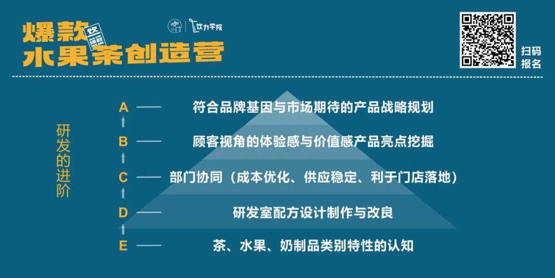 做出爆款水果茶研发至少要具备5种能力水果茶接受度高、选择丰富、容易设计卖点,但想打造出爆款并不容易。很多研发都有这样的问题:素材库不扎实。没有建立味觉素材库的意识,仅了解已经流行的水果;只埋头研发室。会设计配方,但不能和采购、运营协作,门店落地困难;产品构架散乱。没有中长期产品规划,什么火就跟什么,导致被动滞后,迭代方向模糊。产品上新不是竞速赛,能形成经典的爆品不是碰运气。他需要研发者至少具备5种能力: