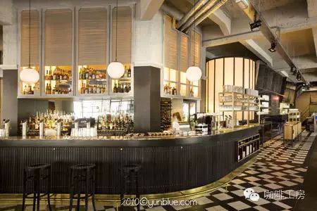 这是一家位于荷兰旧工厂改造成的咖啡馆,原建筑是Philips公司几十年前生产灯泡的工厂,Philips公司将其生产线迁出后,由阿姆斯特丹的设计师Bearandbunny设计工作室负责咖啡馆的整体设计,不单是室内设计,还包括家具设计和产品包装等的平面设计。 看到这家LOFT结构的厂房咖啡馆,同样是旧工厂改建的咖啡吧,同样是特色鲜明的主题餐饮空间,而它们所拥有的室内装饰和内在气质是迥然不同的。如果将蜜桃咖啡吧看做是一位美貌温柔的女子,那么荷兰这家咖啡馆就是位英俊内敛的男士了。 他的硬朗与内敛的气质从门厅已经开始散发。没有多余的装饰,只有顶面一站造型另类的吊灯;没有亮丽的立面造型,只有灰色暗淡的空间。