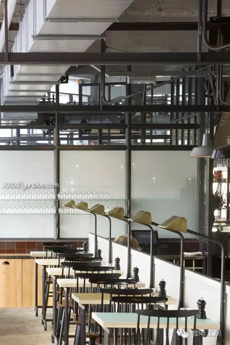 色彩搭配与空间划分同样是亮点。咖啡馆内的椅子是经过特别色彩搭配的,整个色系很柔和醇厚,会让人忍不住做下来享受一杯咖啡的时光;顶面没有吊顶处理,一条条镀锌钢管将空间划分,餐桌边上的钢管支架犹如一道屏风,而柱子是天然的界限。所有一切搭配得那么自然,使我们仿佛置身于工业时代。