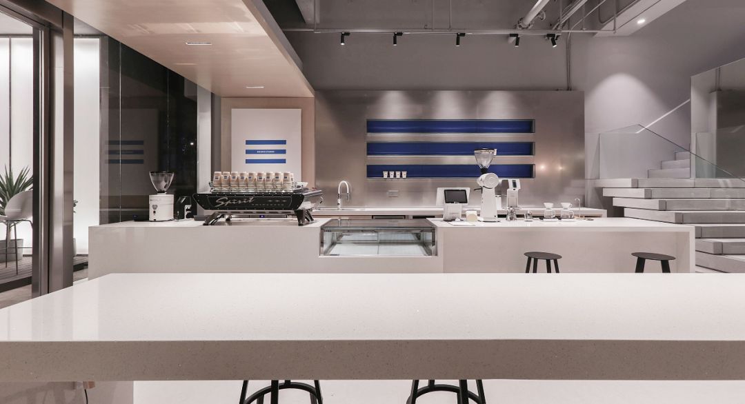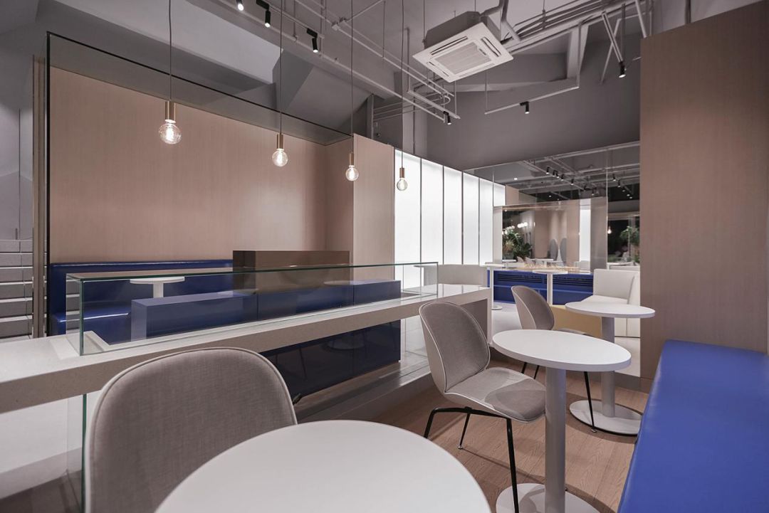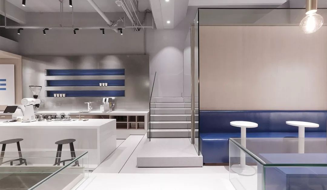 由于自身的店铺的特性,店面被两条巨大的柱子使店面的形象展示受到阻挡。渝恩概念将这一限制转化为契机,将现有的柱子作包裹后使其演变为一副大面积的透光幕墙,使店铺从街道旁凸显出来。为了最大程度地展现ROUDN SUTDIO的品牌意识,整个室内空间以素色为主调对“园外咖啡(ROUDN SUTDIO)”的标识蓝的意识强调。整体室内空间以灰调将贯穿,蓝色点缀则以跳跃的方式存在。