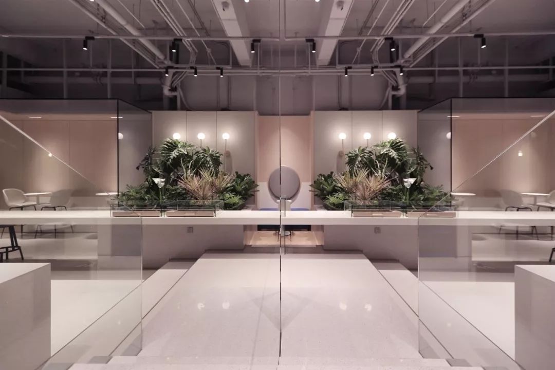 而其中体验区上空的玻璃则利用了一块重达300公斤重的加厚钢化玻璃作为吊顶,在室内中心区域的绿植区我们也利用玻璃相隔,这既能作为玻璃吊顶的承重结构也不影响顾客欣赏绿色的视线。