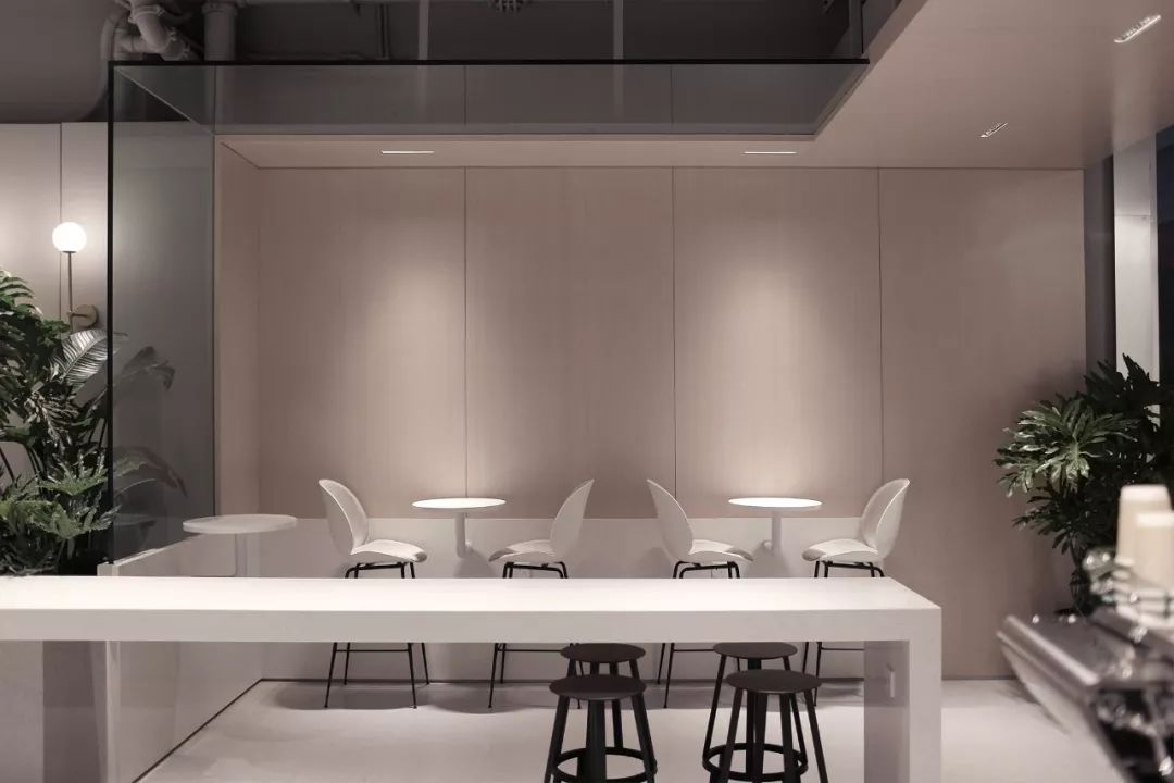 静区则是卡座区,为了让静区不完全孤立,我们利用动区的吧台以挑空的方式从入口一直延伸到散座区以贯穿整个空间,再用几何切割的形式把店内的自助糖品区和烘焙产品柜的两大功能区嵌入在这张吧台,使其形成一条功能动线。而体验区和静区的相隔采用了绿植来丰富两个区域的观感。