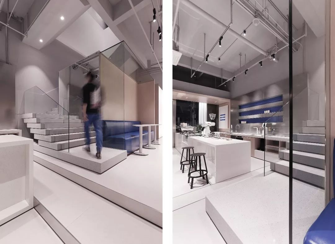 绿植区相对应得则是通往二层办公空间的楼梯,介于楼梯的必然存在,我们把楼梯作为室内空间的装饰品去处理,以方块叠砌的形式制作,配合镜面的延伸使其和卫生间墙身相互融合,从而演变成一个在店内夺目的装饰。楼梯不被孤立 与空间体块完美融合▼