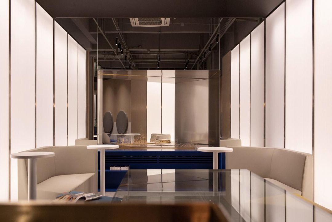 休闲区是室内的尽头,空间也不大。因此,我们呼应了店面的透光幕墙设计以及利用镜面延伸性的特点,试图利用光与影把空间变得不再压抑。而在镜墙的中间我们安置了一个火炉,使整个空间气氛令人得以放松。火炉与透光墙营造一个松弛的气氛▼
